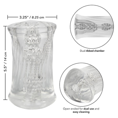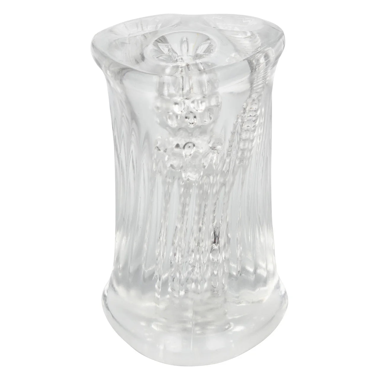 Cyclone Triple Chamber Stroker 5.5 inches Clear from California Exotic Novelties. Intensify your pleasure with the Cyclone Triple Chamber Stroker. This premium masturbator is designed to take your experience to new heights with its innovative features and exceptional design. Featuring an easy grip design, this stroker ensures a comfortable and secure hold, allowing you to fully control your pleasure. The triple ribbed chamber design provides sensational stimulation as you glide through each chamber, delivering mind blowing sensations that will leave you craving more. With its transparent design, you can immerse yourself in the visual delight of every moment, enhancing your arousal and making your experience even more exciting. The soft, tight, and stretchy material of the stroker offers a life like feel that will heighten your pleasure to new levels. The open ended design allows for dual use and easy cleaning. Indulge in the ultimate pleasure with the Cyclone Triple Chamber Stroker. Its multi-chambered design and exceptional functionality are designed to provide you with intense sensations and unforgettable experiences.