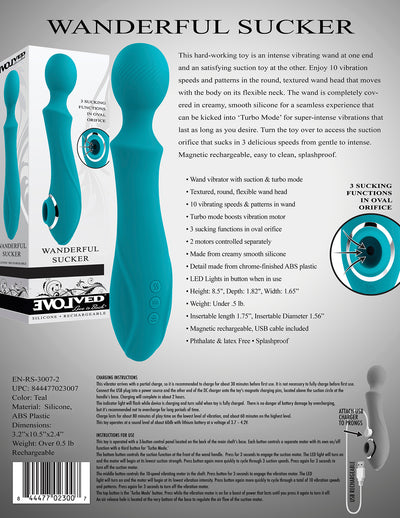 Evolved Wanderful Sucker Wanderful Sucker Wand Massager. This hard working sex toy is an intense Vibrating Wand at one end and an satisfying suction toy at the other. Enjoy 10 vibration speeds and patterns in the round, textured wand head that moves with the body on its flexible neck. The wand is completely covered in creamy, smooth Silicone for a seamless experience that can be kicked into Turbo Mode for super intense vibrations that last as long as you desire. Turn the toy over to access the suction orifice that sucks in 3 delicious speeds from gentle to intense. Magnetic rechargeable. Easy to clean, splashproof.