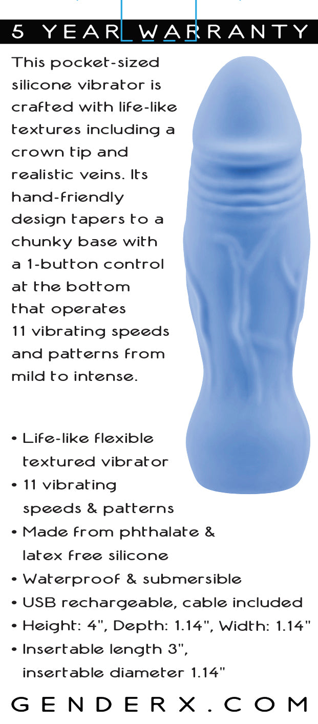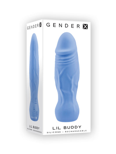 Gender X Lil Buddy Blue Realistic Vibrator from Evolved Novelties. This pocket sized Silicone Vibrator is crafted with lifel ike textures including a penis crown tip and realistic veins. It is hand friendly design tapers to a chunky base with a 1 button control at the bottom that operates 11 vibrating speeds and patterns from mild to intense. Life like flexible textured vibrator. 11 vibrating speeds and patterns. Made from body safe materials that are both phthalate free and latex free Silicone. Waterproof vibrations. Submersible in water. USB rechargeable, cable included. Size height 4 inches by, depth 1.14 inches, width 1.14 inches. Insertable length 3 inches, insertable diameter 1.14 inches. User play time approximately 35 minutes to 50 minutes. Speed of the vibrator determines the time on lower speed lesser time. Charging time 90 minutes. Battery is made from Lithium Ion. 5 years warranty. Categories: Vibrators, Rechargeable Vibrators, Dildos, Dongs, Realistic Vibrators, Realistic Small, Medium Vibrator, Dildos, Dongs Realistic. 2023.