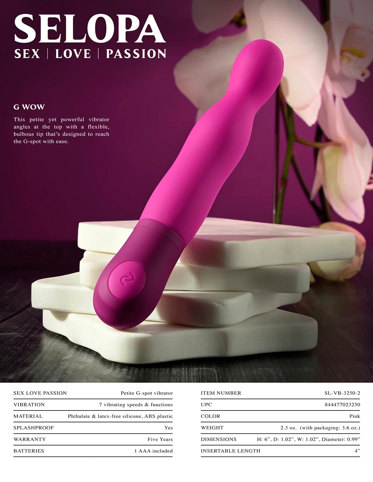 Selopa G Wow Pink G-Spot Vibrator from Evolved Novelties.Sex, love, passion. This petite yet powerful Vibrator angles at the top with a flexible, bulbous tip that is designed to reach the G-Spot with ease. 7 vibrating speeds and patterns.