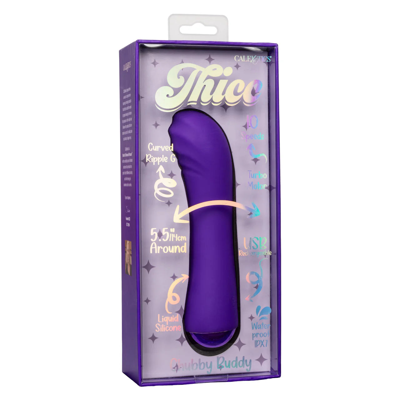 THICC Chubby Buddy from California Exotic Novelties. Experience the Thicc Chubby Buddy, a turbo charged massager designed to fulfill your deepest desires. Its ultra thick 5.5 inches shaft circumference will leave you feeling wonderfully satisfied. The ripple G shaft features an extremely pliable design that hugs every curve, providing exquisite pleasure. Indulge in the 10 escalating speeds of vibration, allowing you to find the perfect intensity for your pleasure. The vibrator is made from liquid Silicone, offering a softer, smoother, and more durable experience. It is also waterproof with an IPX7 submersible rating, allowing you to explore sensual adventures in the bath or shower. Thanks to the state of the art memory chip, it remembers your last used function, so you can easily pick up where you left off. The security travel lock feature ensures discretion during your travels, and the USB rechargeable design with included charging cord makes recharging a breeze. With a complete charge time of 2 hours, the Thicc Chubby Buddy offers up to 60 minutes of thrilling pleasure on high speed and 100 minutes on low speed. Prepare to indulge in intense sensations and discover a world of satisfaction with this sensational massager. SKU: SE-0650-00-3. Color: Purple. 1 year warranty.