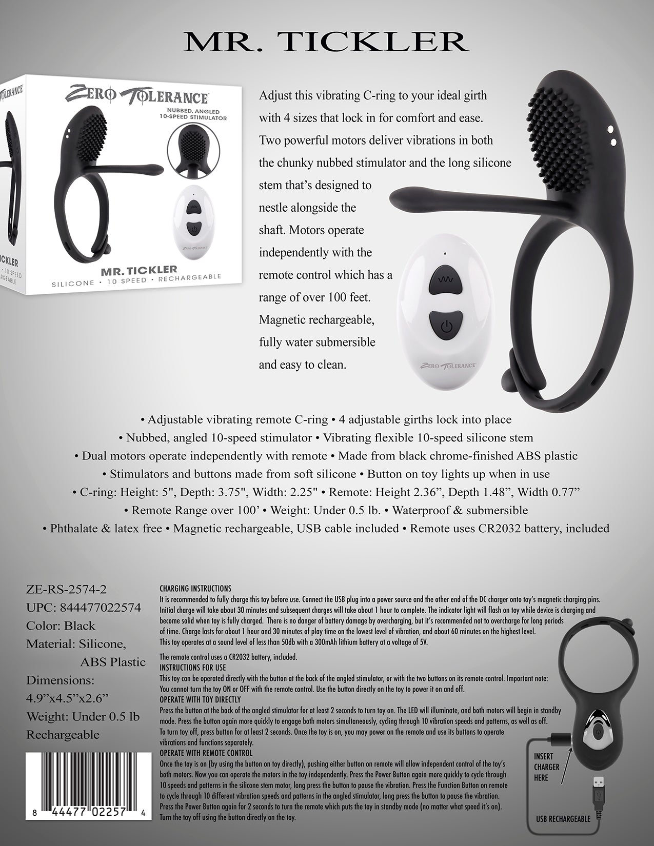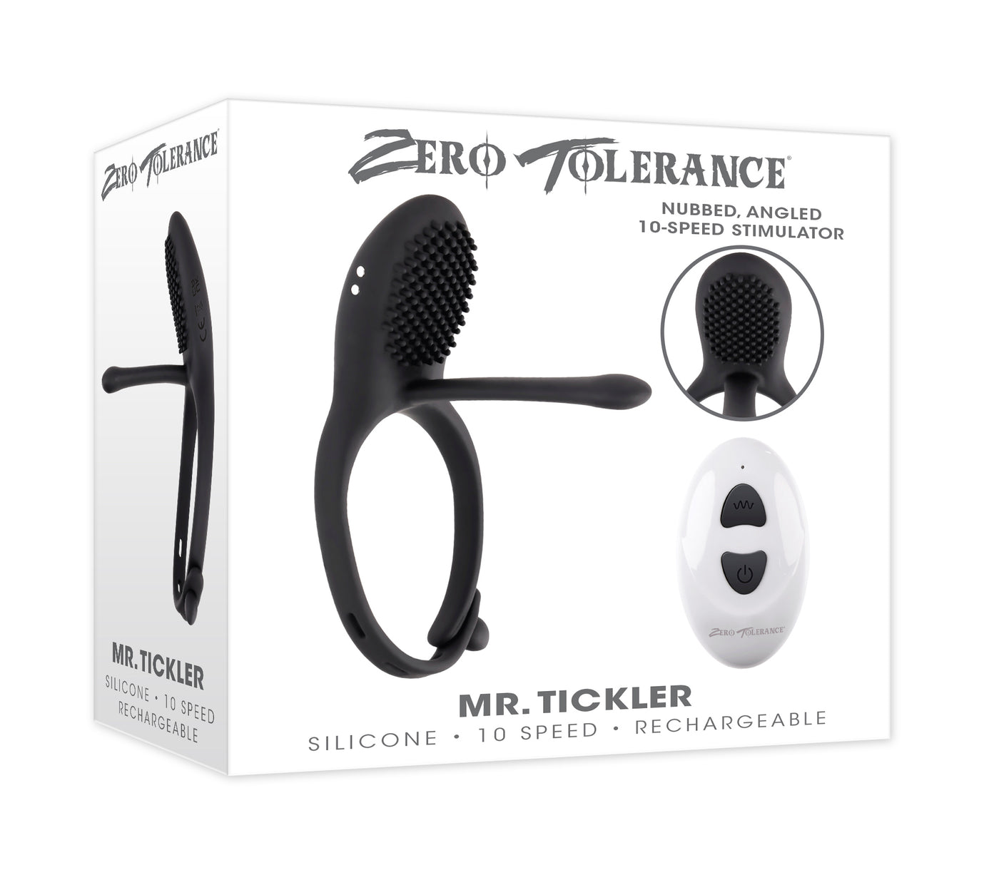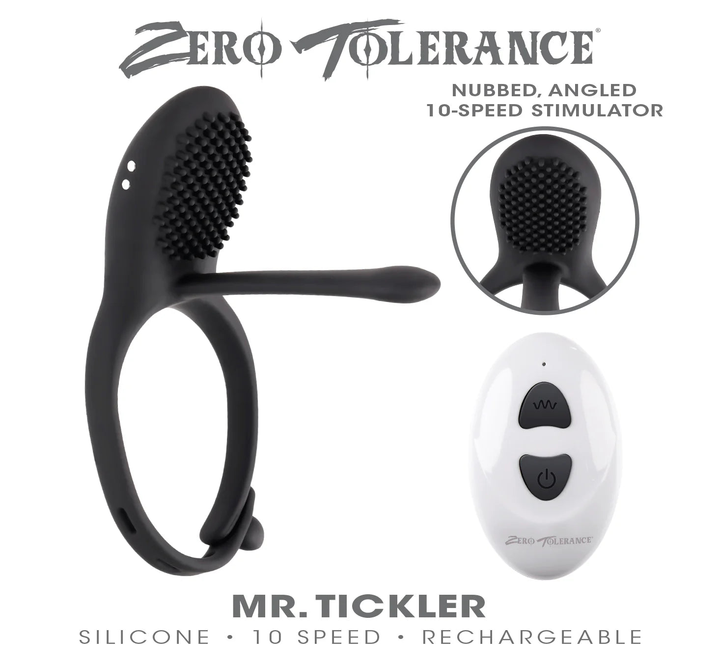 Zero Tolerance Mr. Tickler from Evolved Novelties. Adjust this Vibrating Cock Ring to your ideal girth with 4 sizes that lock in for comfort and ease. Two powerful motors deliver vibrations in both the chunky nubbed stimulator and the long Silicone stem that is designed to nestle alongside the shaft. Motors operate independently with the remote control which has a range of over 100 feet. Magnetic rechargeable, fully water submersible and easy to clean.