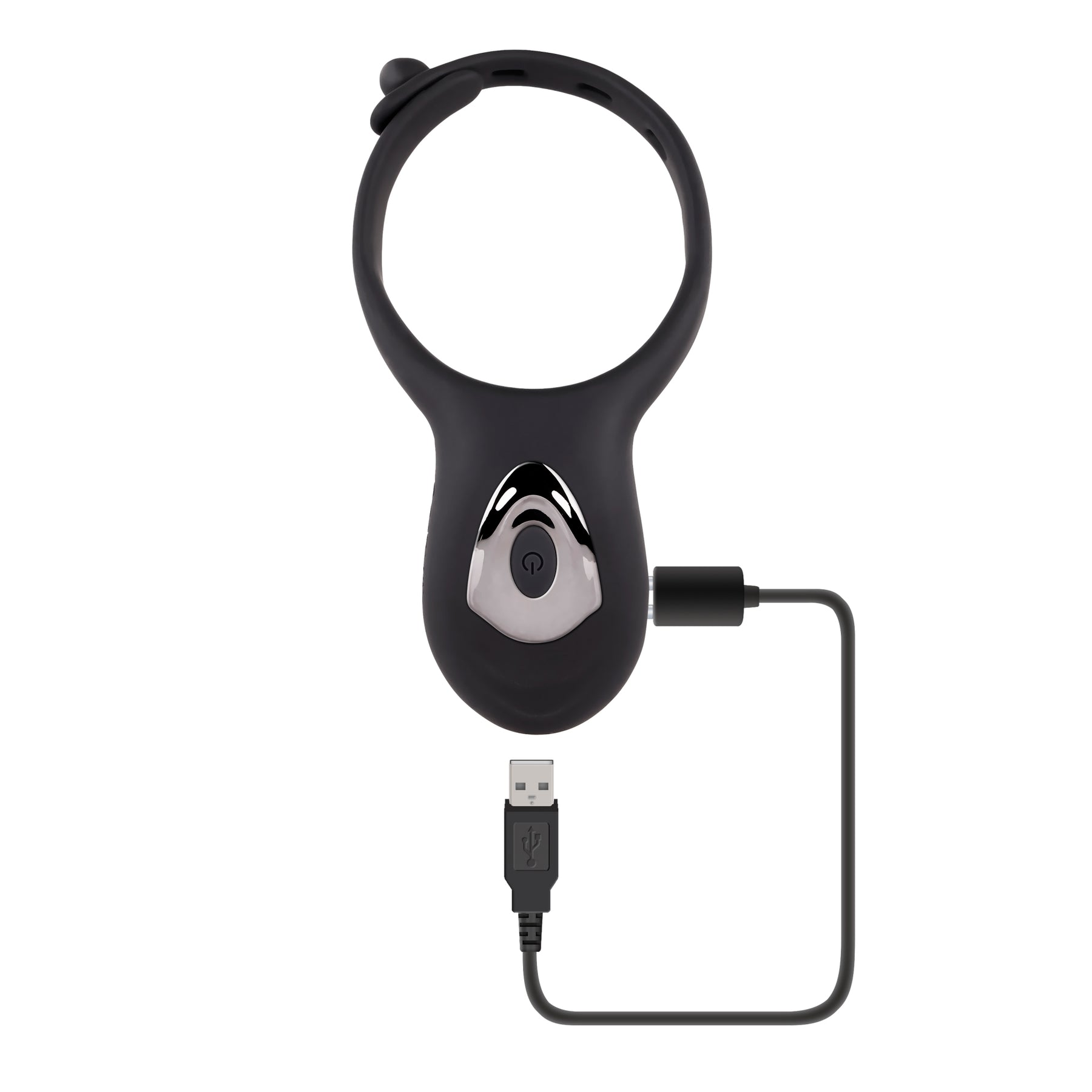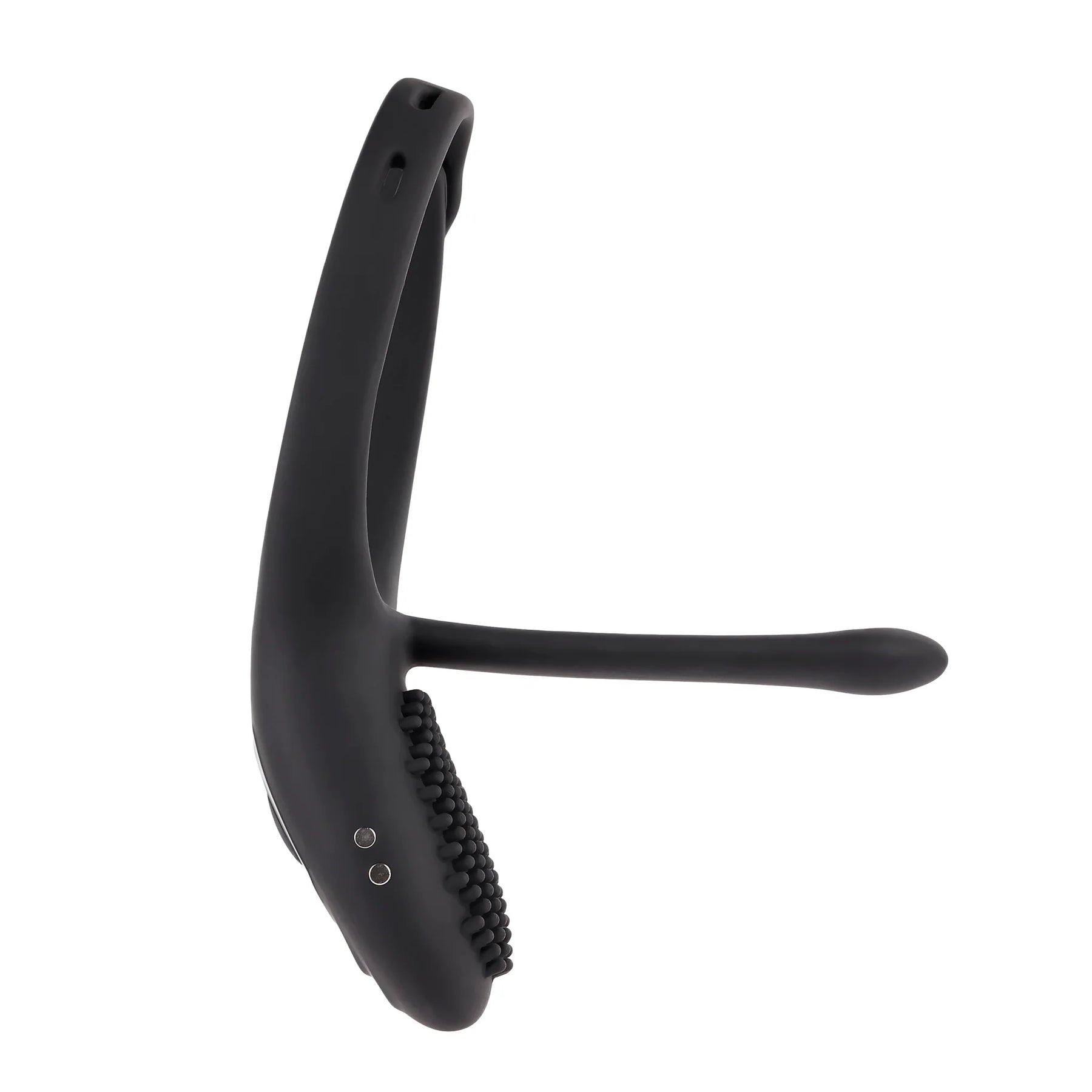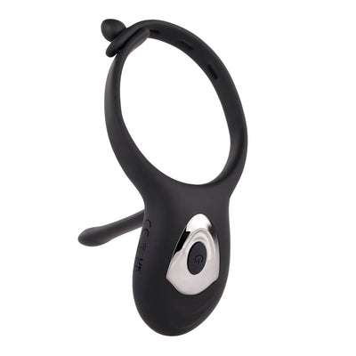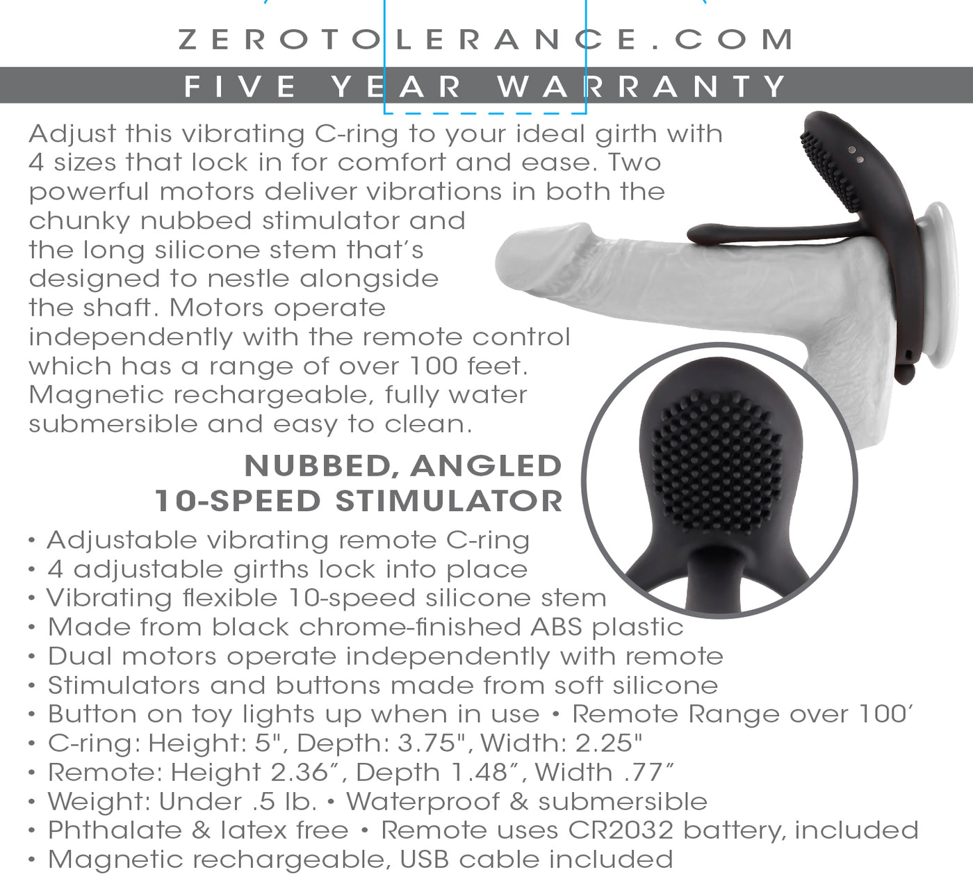 Features: adjustable vibrating Remote Control Cock Ring. 4 adjustable girths lock into place. Nubbed, angled 10 speed stimulator. Vibrating flexible 10 speed Silicone Stem. Dual motors operate independently with remote control. Made from Black Chrome finished ABS Plastic. Stimulators and buttons made from soft Silicone. Button on adult toy lights up when in use. Cock Ring height 5 inches, depth 3.75 inches, width 2.25 inches. Remote Control height 2.36 inches, depth 1.48 inches, width .77 inch. Remote Control range over 100 feet. Bulk weight under half a pound. Waterproof and submersible. Phthalate free and latex free. Magnetic rechargeable, USB cable included. Remote Control uses CR2032 battery, included. Categories: Love Rings, Sex Toys for Men, Couples Cock Rings, Love Rings, Rechargeable Vibrators, Men's Cock and Ball Gear. Video. 2023.