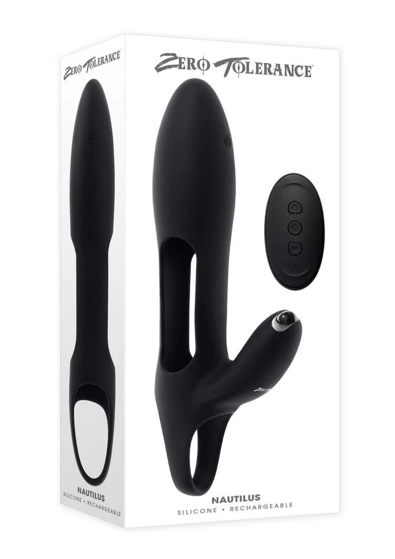 Enhance your intimacy with Nautilus, a unique vibrating toy with a peek-a-boo sheath for expansion and 2 motors that send powerful vibes at strategic points of stimulation. Flexible and stretchy, the main shaft features cut-out openings for better contact while both motors deliver a maximum Turbo Mode to reach ultimate peaks of pleasure. Specs: Made from phthalate & latex-free silicone & ABS 7 vibrating speeds & patterns plus Turbo Mode 2 motors - one in shaft head, one in stimulator Height: 8.94”, Depth: 3.18", Width: 1.88" Insertable length: 6” Insertable diameter 1.88" Remote height: 2.49”, Width: 1.44”, Depth: 0.70 Remote range: 85’ USB rechargeable in 2 charging ports, cable included Remote uses 1 x AAA battery, not included Splashproof