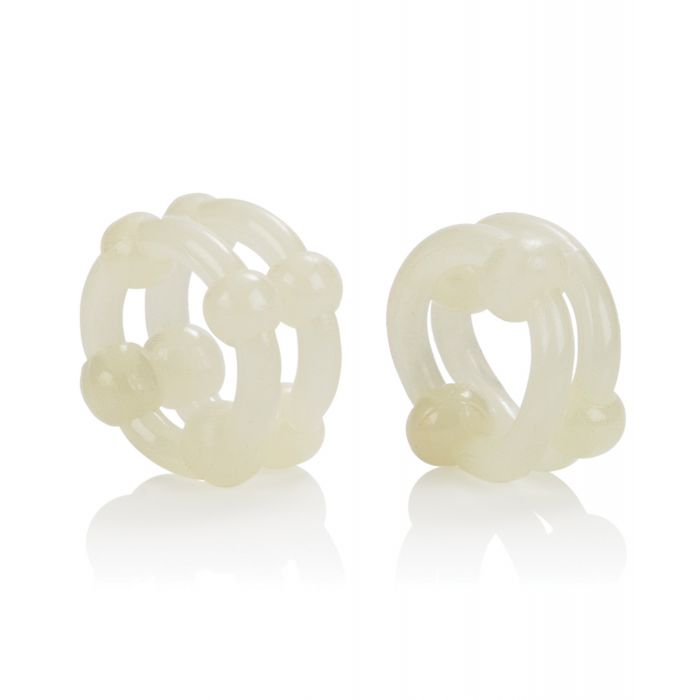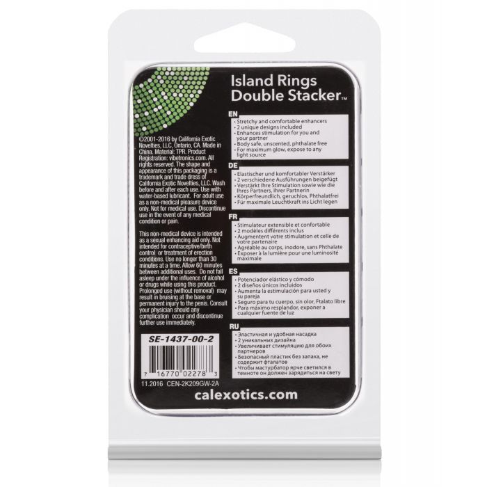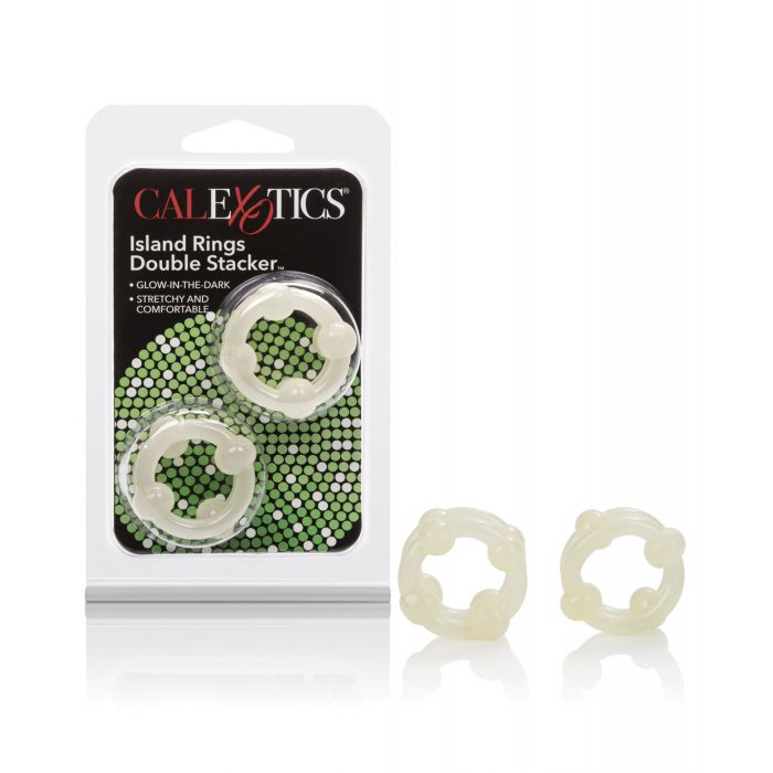 Enjoy twice the delicious pleasure with the Island Rings Double Stacker. The versatile, easy to use erection enhancer provides double support for increased stamina, peak performance and extended play. The super stretchy glow-in-the-dark rings are supplied in a pair and are designed for comfortable wear during prolonged intimate encounters. The stackers boast smooth contours and sensual stimulation beading, for maximized sensitivity and unlimited erotic satisfaction. The rings are made from soft and smooth, TPE, with a glow-in-the-dark finish, and features two connected rings for maximum support. The exotic stretchy cock ring duo measure 0.75”/2 cm and are adorned with sensuous twists and stimulation beads. To use, select your preferred ring and simply slide the erection keeper on to the erect penis, and prepare to enjoy elevated ecstasy. To increase the pleasurable sensations and tingling arousal even further, always use a quality lube with this toy. Explore your wildest hot dreams and secret fantasies, after lights out, with these rings. The glow-in-the-dark, flexible and durable support rings are perfect for first-time and experienced users and great for spontaneous, intimate explorations. Slip on the dual stack enhancer and indulge in tantalizing super-sized pleasure, whenever you are in the mood for intimate fun. Before and after every use, remember to clean the adornment rings with warm soapy water, or with a toy cleaner spray.