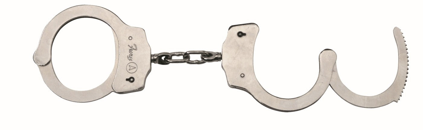 Bondage Gear handcuffs. Metal handcuffs. Nickel coated steel. Spartacus handcuffs are available in dual locking and single locking. A double lock ensures that jaws will not travel in either direction. When it's time for tough love, handcuffs can turn an ordinary encounter into an erotic fantasy. Dual lock handcuffs in black or nickel finish. Each sold separately. Handcuffs come with 2 release keys. Always establish a code word for stop. Issue keys to both partners. Play responsibly. Spartacus A Passion For Quality page 44.