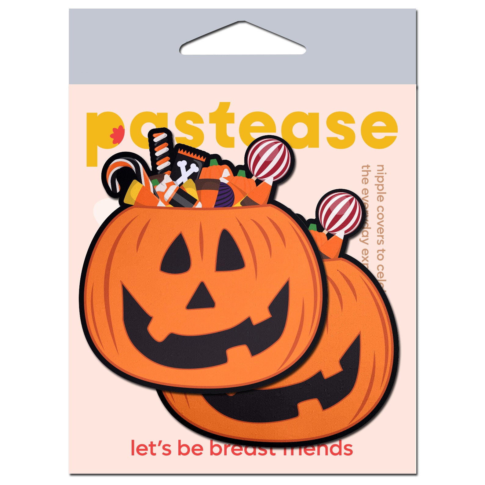 Trick or Treat Pumpkin Pasties with Candy Nipple Covers by Pastease Brand. Be the candy! Get ready to bewitch and bedazzle this Halloween season with our Trick or Treat Pumpkin nipple pasties. As you embark on your eerie escapades, let the iconic pumpkin head, brimming with tantalizing Halloween candy, become your ultimate festive accessory. Dimensions: 2.7 inches by 2.9 inches. Coverage: 2.4 inches. Iconic Halloween Enchantment: the classic trick or treat pumpkin head takes center stage, exuding an air of mystique and Halloween enchantment that sets the stage for your spooky adventures. Overflowing Candy Cornucopia: behold the captivating sight of a pumpkin head overflowing with Halloween candy – an ode to the sweet indulgence that accompanies the season's frightful fun. Soft and Spooky Comfort: crafted from a soft poly blend material, our breast pasties provide a comfortable and snug fit, ensuring you revel in the spirit of Halloween festivities without a care. Elevate Your Costume: Whether you are conjuring spells at a haunted party or joining a midnight masquerade, these nipple covers transform your look into an enigmatic masterpiece that's as alluring as a witch's potion. Festive and Frightful: perfect for pumpkin patch outings, haunted hayrides and all the seasonal costume parties. These unique breast covers capture the essence of Halloween in all its spooky glory. Bring your Trick or Treat Pumpkin Pastease to life and embark on a hauntingly stylish journey. Add an eerie twist to your attire with some good old Halloween nostalgia. Categories: Holiday item, Halloween items, Lingerie, Clothing, Sexy Costume Accessories, Pasties and Accessories. Restricted, Amazon Restricted. 2023-2024 Catalog.