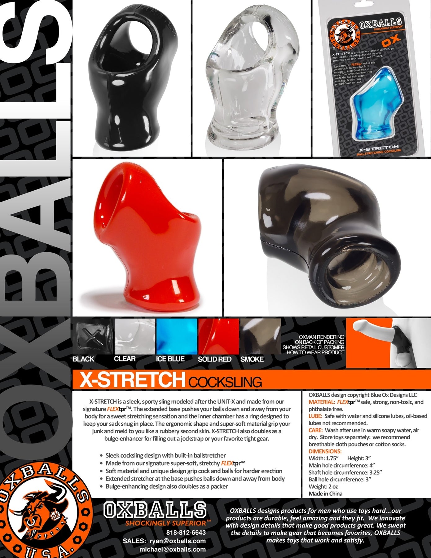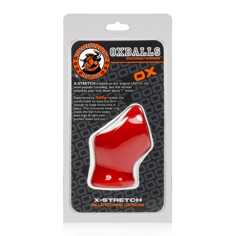 X-Stretch Sling Red from Oxballs Shockingly Superior. X-Stretch Sling is a sleek, sporty sling modeled after the Unit-X and made from our signature Flex TPR. The extended base pushes your balls down and away from your body and the inner chamber has a ring designed to keep your sack snug in place. The ergonomic shape and super-soft material grip your junk and meld to you like a rubbery second skin. X-Stretch also doubles as a bulge enhancer for filling out a jock strap or your favorite tight gear. Based on the best selling Unit-X, the X-Stretch version adds more squeeze to your sack. It grips the base of your dick and balls while pushing your nuts down low in their ball bag. It is sleek and super stretchy just like the Unit-X but with an extra inch of rubbery ball stretching. Oxballs invented the original Cock Sling, this cock ring works the same way but it is slimmer and fits better with no extra bulk. Nothing feels like a sling on your penis. It feels just like when you grip the base of your meat and balls with your hand and squeeze. X-Stretch grips all of your junk and even stretches your sack too! There is an inner ring near the bottom that keeps your balls, even high and tight ones, pushed down. It is squishy enough it will fit even huge ball sacks. If you are the kind of guy who is into full on junk in action. Unit-X Stretch Sling is perfect for slipping your whole package, balls and all up a sloppy sex hole. Made from our exclusive Flex TPR blend, it is non-toxic, phthalate free, and no scent. This blend feels like Silicone but stretches even further. Categories: Love Rings, Cock Rings, Men's Cock, Ball Gear, Gentlemen Cock Rings. 2022.