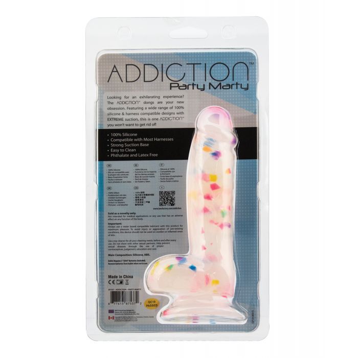 Allow me to introduce you to the life of the party, Marty! Party Marty brings a vibrant and celebratory approach to pleasure – 7.5 inches of rainbow-assorted confetti and frost – to be exact. Party Marty lifts spirits and brightens the day by adding a playful and fun flair to the ordinary dong! With a superior suction cup coupled with its compatibility to attach itself to most harnesses, the answer should be clear which Addiction product should be on your "To Buy" list. Features: Premium Frosted Silicone Extreme Suction Base Harness Compatible Girthy Material: Silicone Dimensions: Overall Length - 7.5 inches Insertable Length - 5.5 inches Width - 1.5 inches