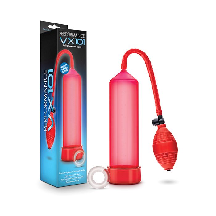 The Performance VX101 Pump is a beginner's pump made better. Featuring a medical grade ball pump, an easy release connector, and a quick release valve, this pump is designed to guarantee your safety. It includes a soft, non-porous PVC cylinder seal for a comfortable feel and increased suction. The cylinder is made from impact-resistant plastics and is sized to fit most., this Performance Pump is easy to clean. It also comes with a Stay Hard C Ring to enhance your playtime! 9 Inch Length (8.5 Inch Insertable) x 2.5 Inch Width. PVC Pump Sleeve with Pressure Release Valve. New Improved Ball Pump Offering More Suction. 1 Cock Ring Included. Made of Non Porous Polycarbonate. Contains no Fragrances, Phthalates, Paraffins or Latex.