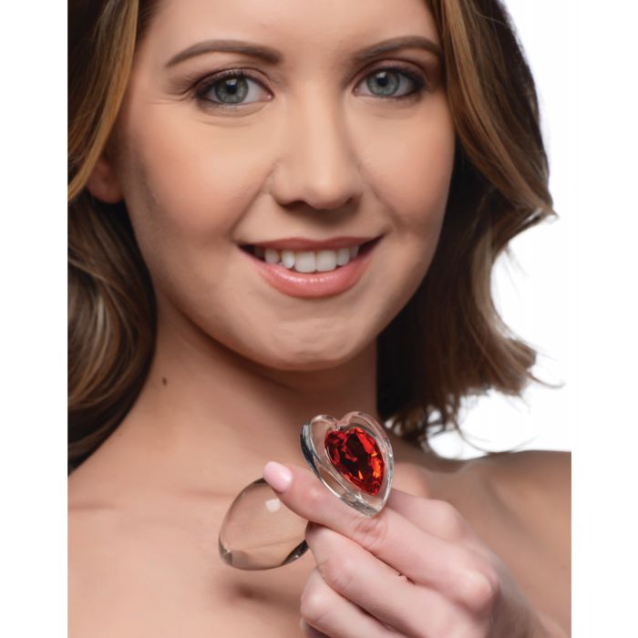 Decorate your derriere with a sparkling red heart! Display your love between your cheeks with these see-through glass butt plugs - the solid mass and smooth surface fills your backdoor with a satisfyingly hard sensation! Perfect for warming up or as a dedicated anal pleasure toy. Smooth and tapered for easy entry without discomfort and compatible with most lubricants so you can play your way. Heat or chill this heart shaped anal dream for an an extra layer of pleasure! This see through glass plug is naturally body safe and hypoallergenic for those with sensitive bodies. The smooth texture also makes these plugs easy to clean with warm water and mild soap - be sure to clean before and after use! Perfect for warming up your backdoor for rougher play or simply as a treat for the eyes for your partner while they enjoy the rest of your body! This small size plug is perfect for beginners starting their anal journey or for those who prefer smaller anal toys. Insert this heart shaped Booty Spark and make that booty sparkle! Measurements: Overall length 3.3 inches, insertable length 2.7 inches, 1.3 inches at widest diameter. Materials: Glass, ABS Plastic.