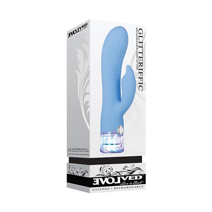 Let the good vibrations flow through your whole body as you pilot your glitter vibe to sparkling satisfaction! 10 powerful vibration speeds drive two separate motors that are strategically placed for maximum pleasure in the shaft and clitoral piece, and the easy-to-use one-button control lets you focus on your feel-good experience. Take your new toy underwater with you because it’s completely submersible and watch the glitter handle shine with even more luminosity! Clean with Evolved Toy Cleaner and a warm water rinse.