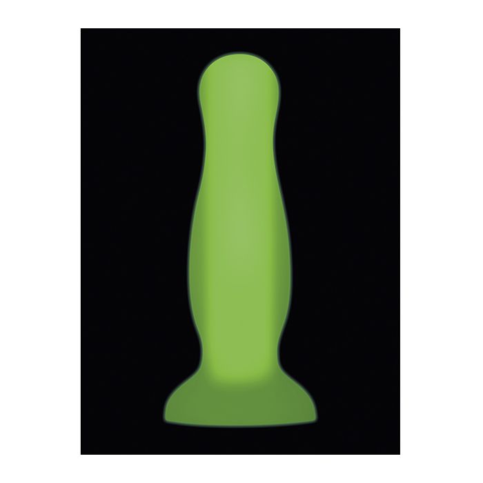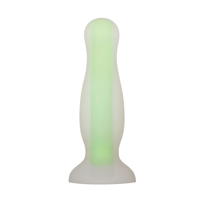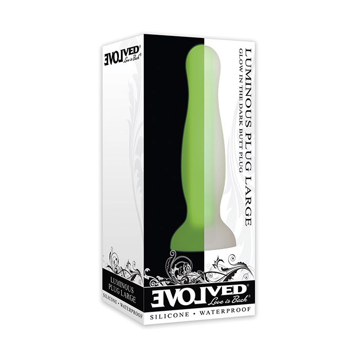 Glow in the dark while you experience a mind-blowing orgasm! The large butt plug glows a groovy green at its inner core, with a dual layered silicone shaft that feels squishy and soft and flexes with your body. Advanced anal players will love the size and the bowling pin shape that tantalizes upon entry and then keeps giving until you say stop!. Flared base for safety and a powerful suction cup for hands-free play. Five year warranty.