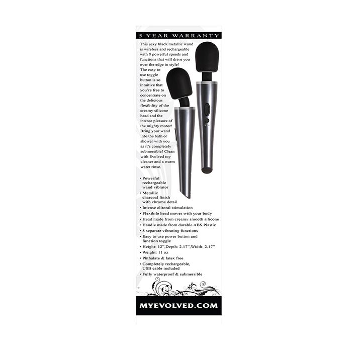 This sexy black metallic wand is wireless and rechargeable with 8 powerful speeds and functions that will drive you over the edge in style! The easy to use toggle button is so intuitive that you’re free to concentrate on the delicious flexibility of the creamy silicone head and the intense pleasure of the mighty motor! Bring your wand into the bath or shower with you as it’s completely submersible! Clean with Evolved toy cleaner and a warm water rinse.
