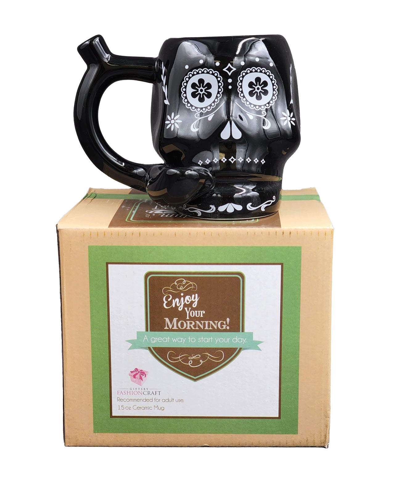 Sugar Skulls are used in the traditional Mexican celebrations of the Day of The Dead. These stunning Roast & Toast mugs make great gifts for friends who enjoy a special 'smoke' every now and then. This trendy novelty mug is made of ceramic and holds around 15oz. It comes in black with a stunning Sugar Skull design in white hilights. Attached to the front of the mug is a pipe where you can pack your tobacco and light it. The smoke filters up the hollow handle to the mouthpiece on the top, allowing you to enjoy a smoke with your steaming coffee. It is microwave and dishwasher safe and comes packaged in a color gift box. This product is recommended for adult use only. Capture the Mexican spirit of Dia de los Muertos, the Day of the Dead, while you enjoy a smoke and a coffee with like-minded friends.