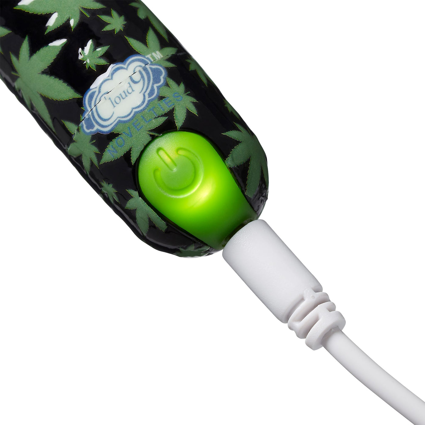 420 Personal Vibrator Stubby Vibe Black Cannabis Leaf from Cloud 9 Novelties. Celebrate the cannabis culture with a discreet and petite rechargeable bullet vibrator. This uniquely patterned Cloud 9 Novelty 420 Vibrator fearures 10 speeds of vibration patterns and an ergonomic shape the 420 Vibe features a powerful motor. Perfect when on the go. This Vibe is silky smooth with a velvety feel for comfort. The strong motor delivers intense vibrations that will take you to new heights.