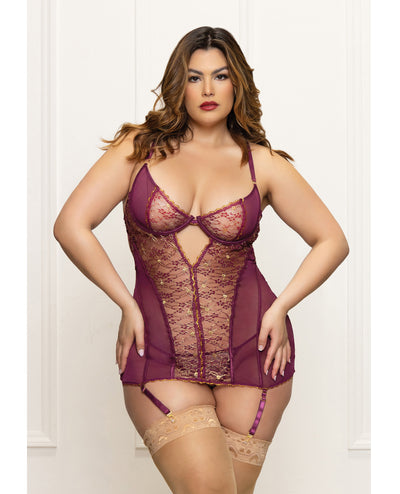 Hella Raw Metallic Lace with Mesh Gartered Chemise & Thong - Plum 1X/2X
