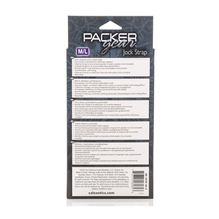 The Packer Gear ™ Jock Strap the ultra-soft strap on harness designed with powerful performance and stretch-to-fit comfort in mind. This classic harness has a supportive extra-wide waistband, soft stretchy material and internal probe straps for the ultimate support. Enjoy double penetration pleasure with the accommodating 2-panel design and unique bullet vibrator stimulation pocket. The durable, reinforced O-ring stretches to accommodate your favorite packer, vibrator or strapless dildo. Beginners and expert users alike will love frustration-free pleasure with this easy-to-wear harness. Simply secure your favorite probe, slip into the extra stretchy waist and thigh straps and dive deep into passionate penetration or enjoy comfortable all-day wear. Enjoy easy clean up by hand washing and hanging to dry.