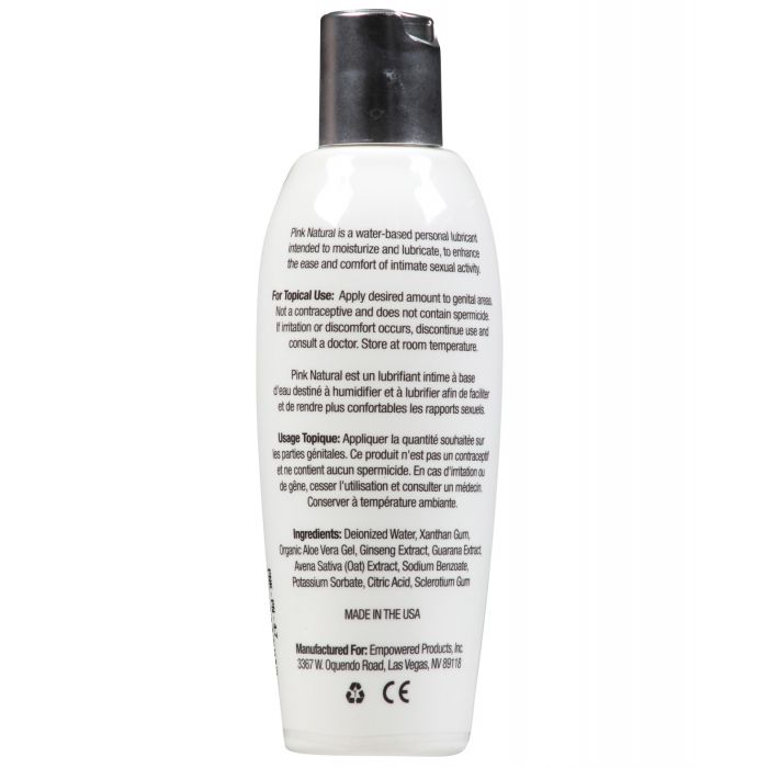 PINK® Natural is our new water-based lubricant designed for women and couples looking for very high-quality body-conscious formulations. PINK® Natural combines de-ionized water and Organic Aloe Vera Gel, fortified with extracts of Ginseng, Guarana and Avena Sativa (Oat). We minimized or removed most other ingredients from our very popular PINK® Water formula to create PINK® Natural.