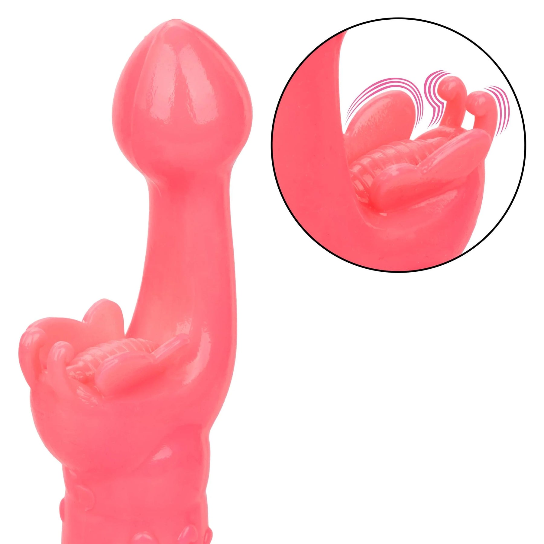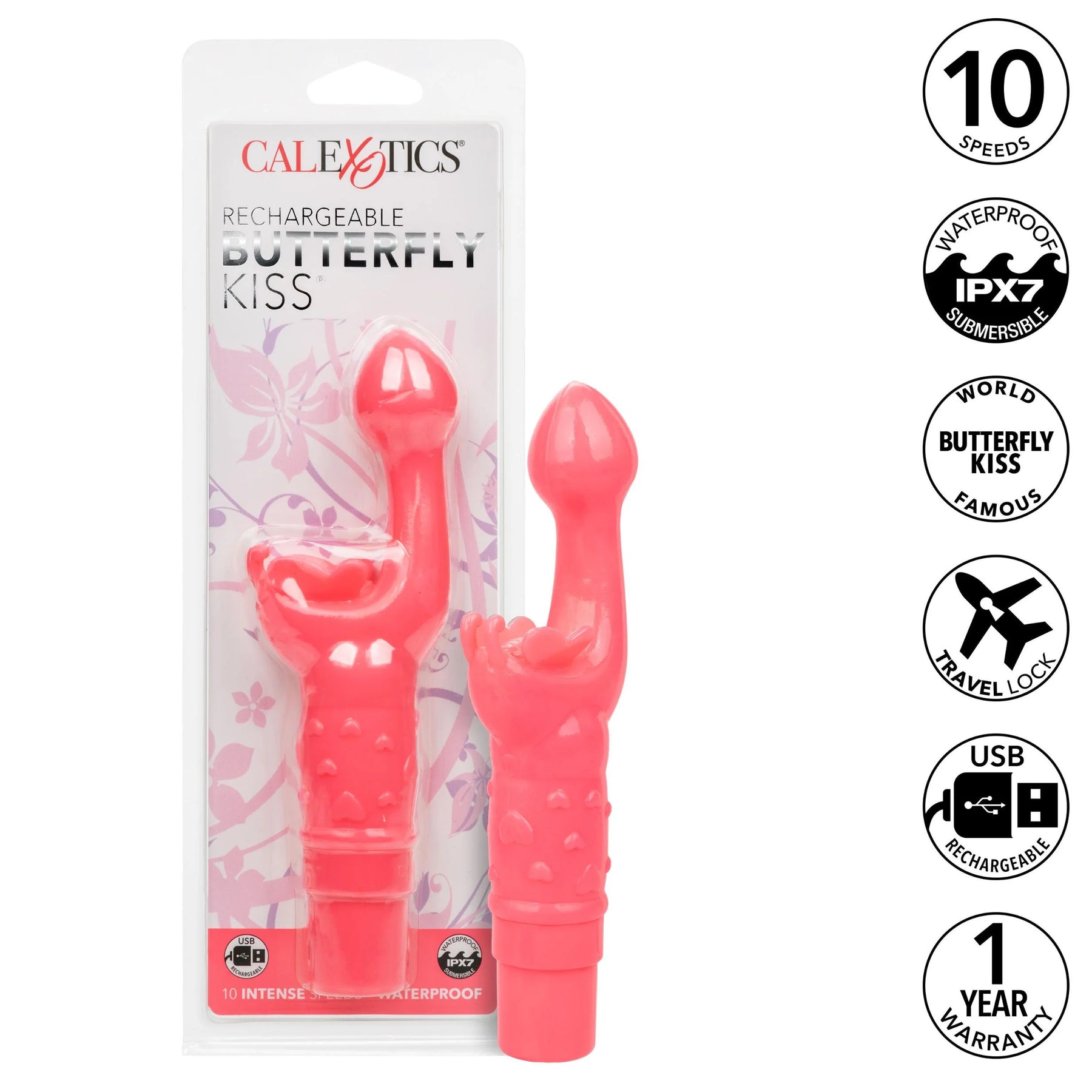 Rechargeable Butterfly Kiss Pink Vibrator from California Exotic Novelties. Indulge in the electrifying pleasure of the Rechargeable Butterfly Kiss. This sensational adult toy combines the allure of a fluttering Butterfly with a G-Spot stimulator, delivering dual stimulation that will leave you craving more. With its enticing fluttering wings and tantalizing antennae, it provides optimal arousal and titillation. With 10 incremental speeds of vibration, you have complete control over your pleasure journey, allowing you to customize the sensations to suit your desires. Crafted from body safe materials that are unscented and phthalate free, this toy prioritizes your well being while delivering intense pleasure. It is waterproof and IPX7 submersible rating adds versatility, allowing you to explore thrilling experiences in the shower or bath. Equipped with a state of the art memory chip, this sex toy remembers your last speed setting, ensuring a seamless experience every time you use it. The USB rechargeable feature provides convenience with an included charging cord. With a quick charge time of 1.5 hours, it offers up to 30 minutes of high speed stimulation and 70 minutes of blissful play on the low speed setting. Unleash your desires with the Rechargeable Butterfly Kiss, a tantalizing companion that guarantees unforgettable moments of pleasure and satisfaction.