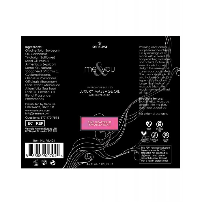 The Me and You line of luxury massage oils are infused with (gender-friendly) pheromones to make both partners feel attractive and turned on. We've added our special hyper-glide, which has a touch of silicone so that your massage oil or lotion can stay on the surface of your skin longer. A little goes a long way and you will end up using less product and be able to enjoy a longer lasting massage. Made with natural ingredients and a blend of moisture-rich oils, essential oils and natural preservatives. 4.2oz. Grapefruit Vanilla.