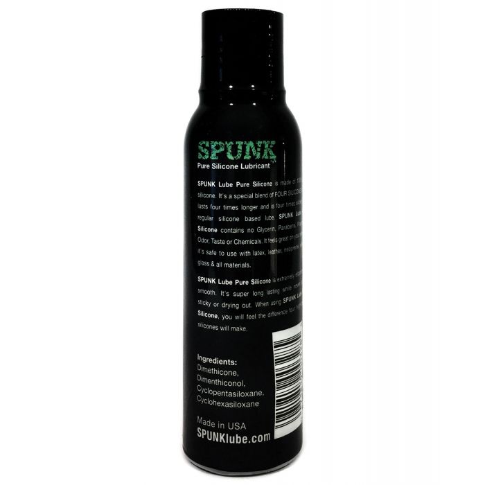 SPUNK Lube Pure Silicone is non drying during use. It's a special blend of 100% pure clear silicone that will outlast you. It's free from glycerin, parabens, propylene glycol & other ingredients. SPUNK Lube Pure Silicone is sex toy safe, non staining & softens your skin. It's silicone based but cleans up much easier than traditional silicone based lube because it doesn't contain any additives or preservatives. SPUNK Lube Pure Silicone is perfect! It doesn't get sticky or tacky and it's also safe to use with ALL materials including most silicone sex toys. It's great for sensitive skin and it feels amazingly smooth. SPUNK Lube Pure Silicone is NON DRYING and has an infinite shelf life since it doesn't contain any water or additives. It's pure silicone. SPUNK Lube Pure Silicone Ingredients: Dimethicone, Dimethiconol, Cylopentasiloxane, Cyclohexasiloxane.