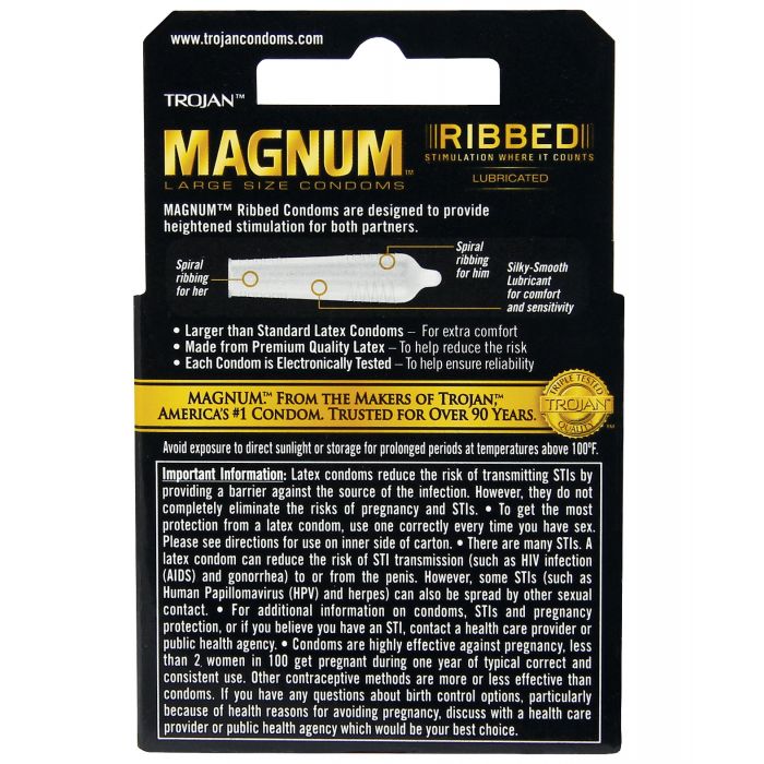 Trojan Magnum Ribbed Condoms are designed to provide heightened stimulation for both partners. Spiral ribbing towards the tip to increase stimulation for the most sensitive area. Spiral ribbing towards the open end to increase stimulation for her most sensitive area. This larger than standard latex condoms for extra comfort with silky-smooth lubricant for comfort and sensitivity. Made from premium quality latex to help reduce the risk. Each condom is electronically tested to help ensure reliability. Box of 3.