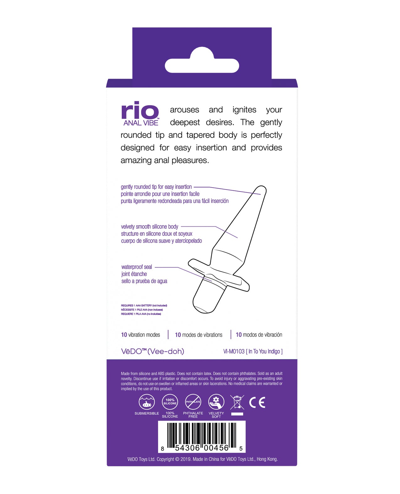 VeDO Rio ANAL VIBE arouses and ignites your deepest desires. The gently rounded tip and tapered body is perfectly designed for easy insertion and provides amazing anal pleasures. Powerful motor. 10 vibration modes. One button easy control(TM). Extremely quiet. Designed for an easy insertion. Waterproof - submersible. 1xAAA (not included). Running time 2 hours. Length: 13.5cm. Max diameter: 3cm.• 100% Silicone • 100% Phthalates Free • One Year Warranty
